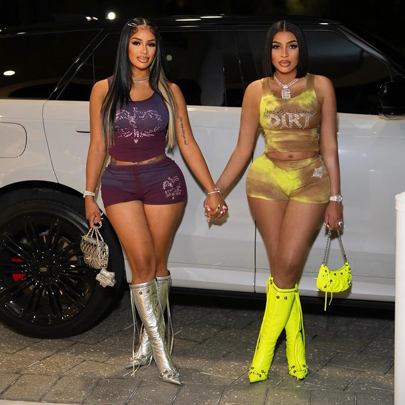 Sexy Hot Girl Mesh Butterfly Print Pleating Sling Vest Shorts Set